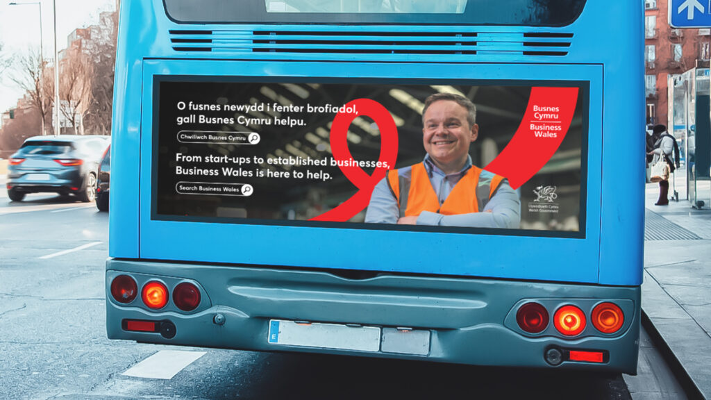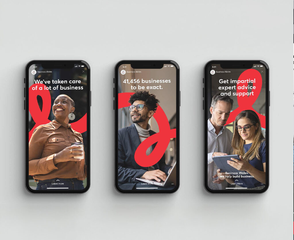 Our solution was to evolve the brand to stand out and reinforce its role as the ultimate one-stop-shop for entrepreneurs. The promise “Helping to Build Business” became more than a tagline, it signified partnership and progress. A dynamic graphic device in BW red symbolised the entrepreneurial journey: discovery, growth, resilience, success. This refreshed identity gave the campaign a distinctive, memorable look that celebrated ambition and positioned Business Wales as a trusted partner at every stage.