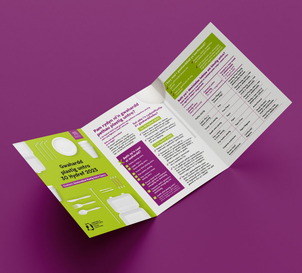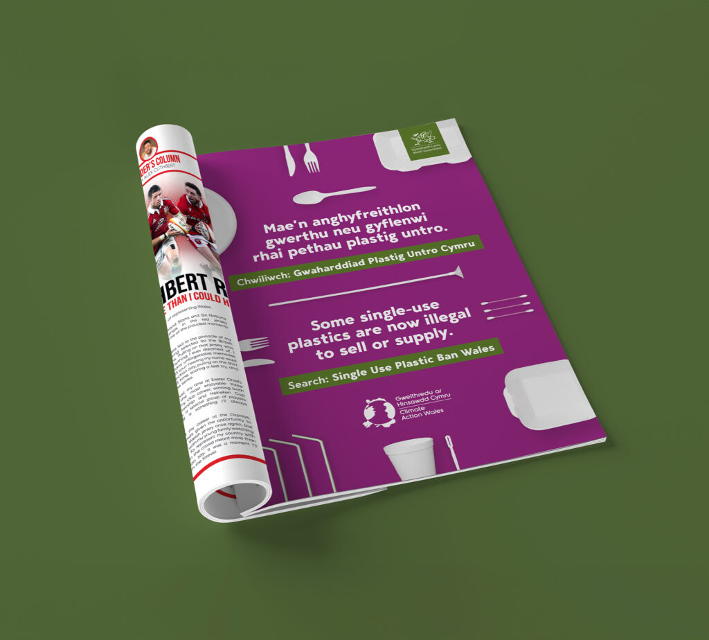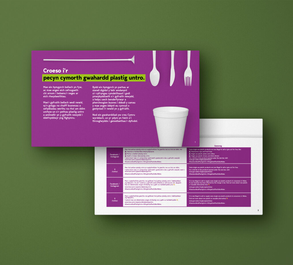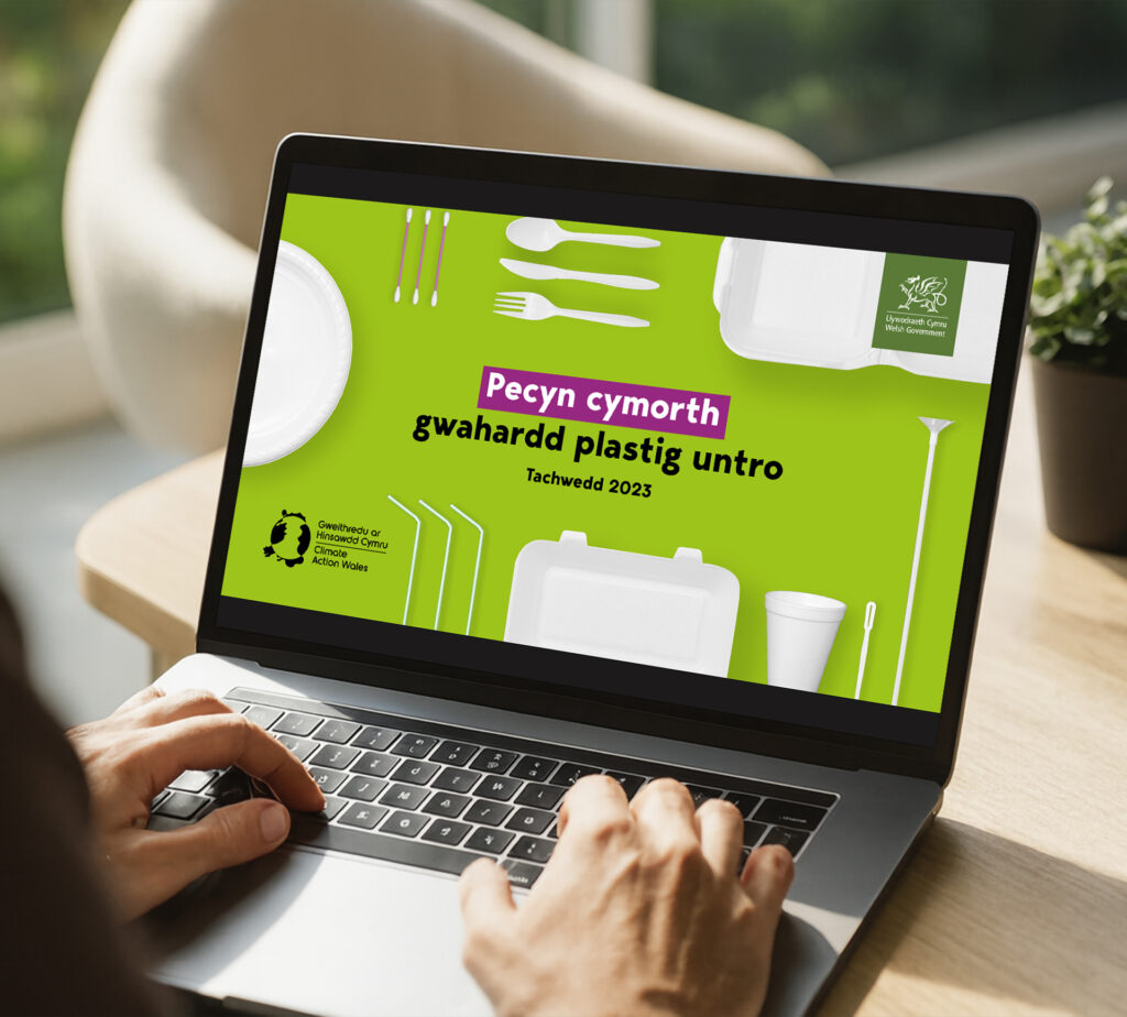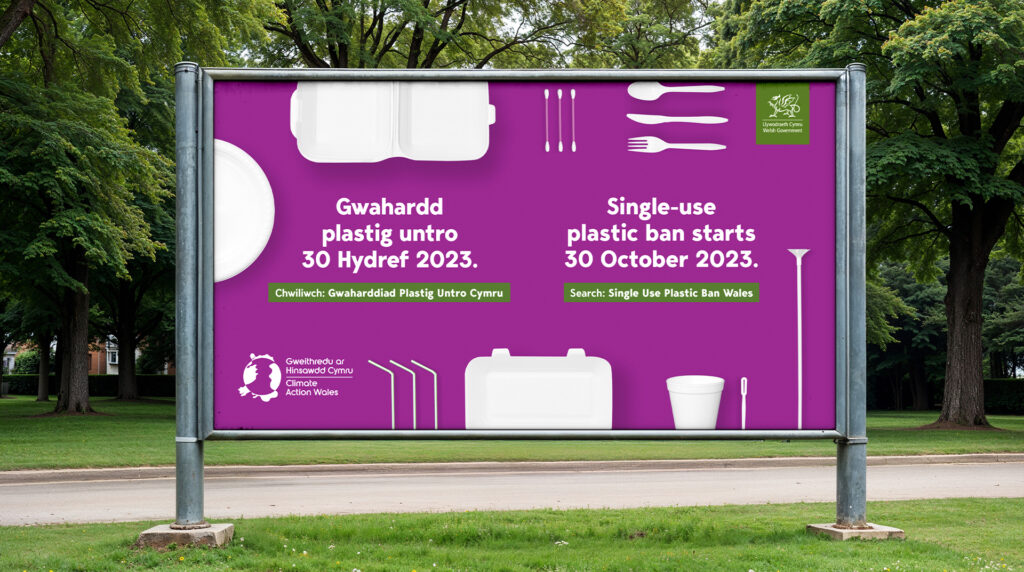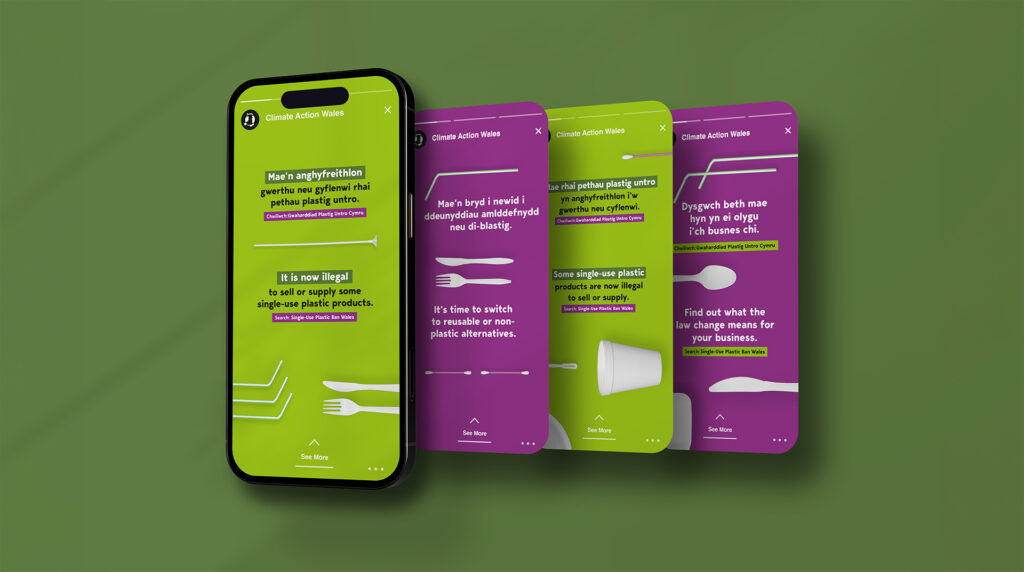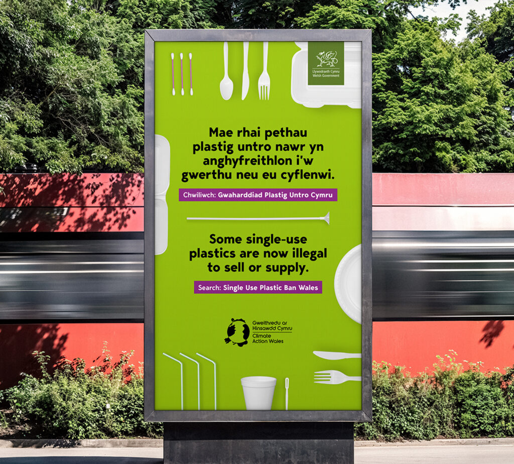 To stand out, we used a bright, bold visual style and a lively tone. Our hero asset-a stop-motion animation featuring banned items-made the law easy to understand and memorable. We also produced bilingual and community-language materials, posters, leaflets, and a stakeholder toolkit, all aligned with the Climate Action Wales brand.